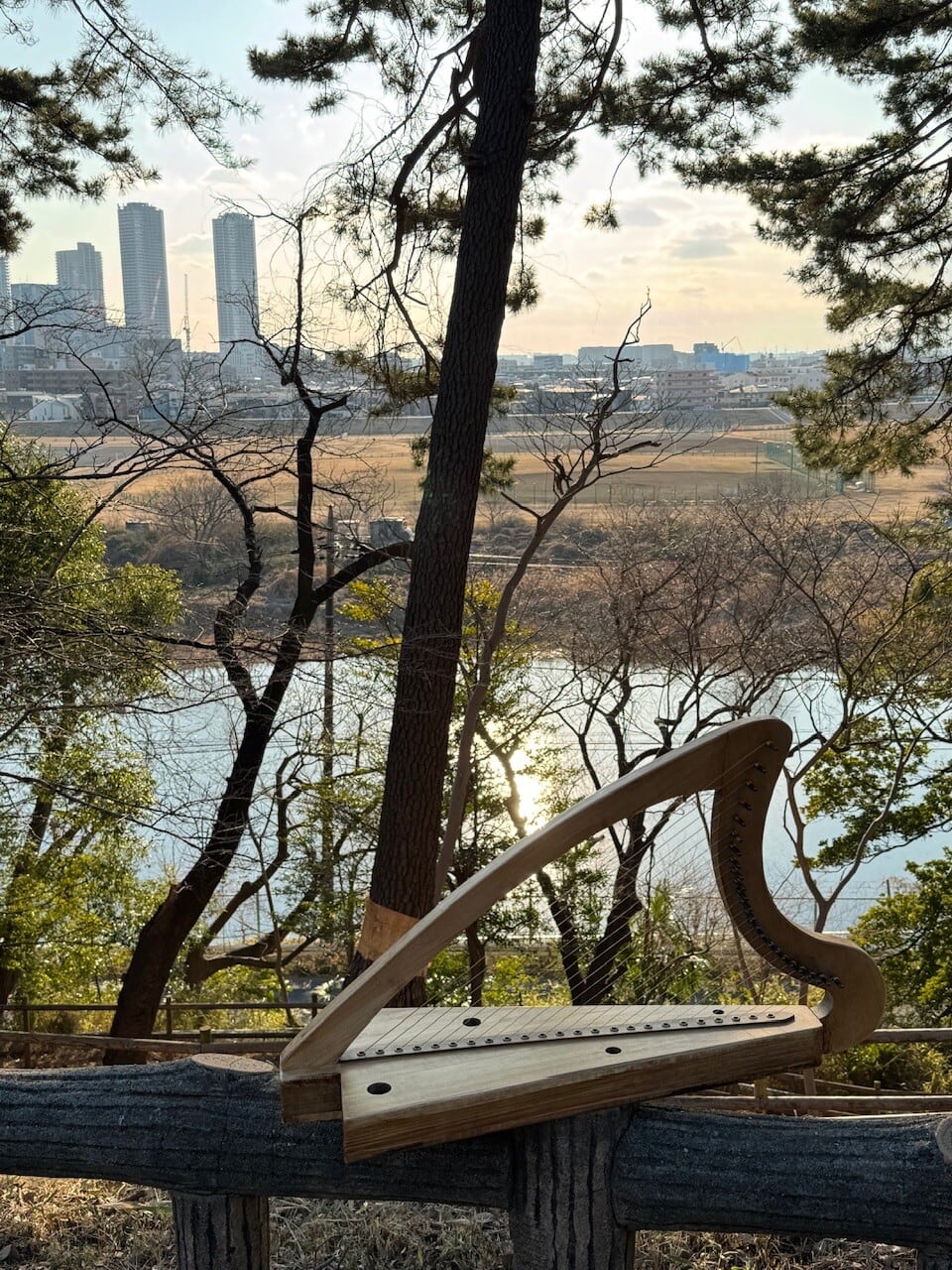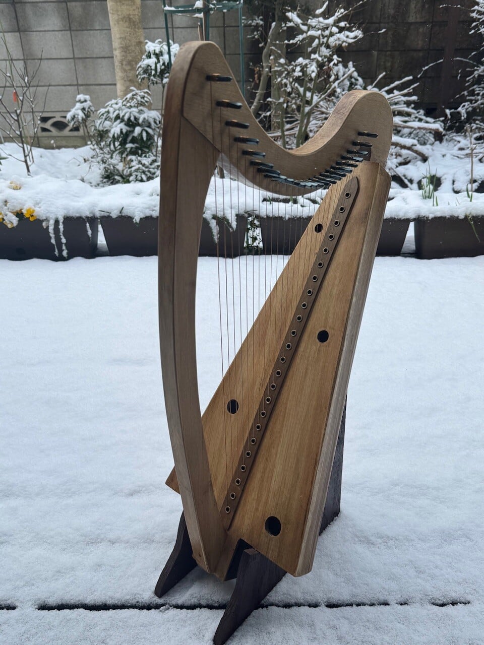 2026年の新モデル。弦の角度や、共鳴胴の板の薄さ等を変更することで、レスポンスが良いクリアな音色と、艶のある低音を実現。伝統的なアイリッシュ・ハープに見られる共鳴胴下の両サイドをカットしたデザインを採用し、膝に乗せたときの安定感が得られ、最高音域へのアクセスがしやすい構造。