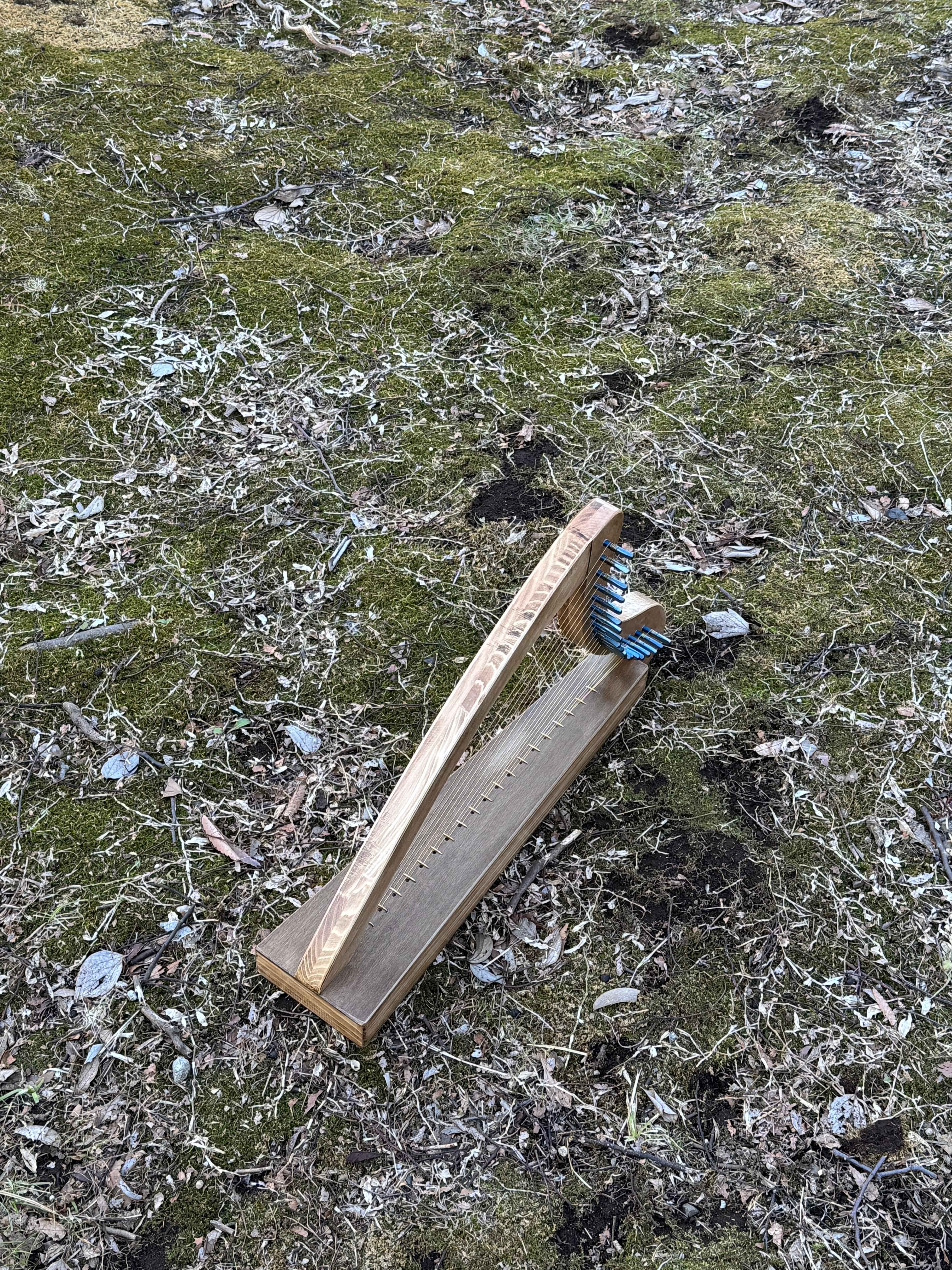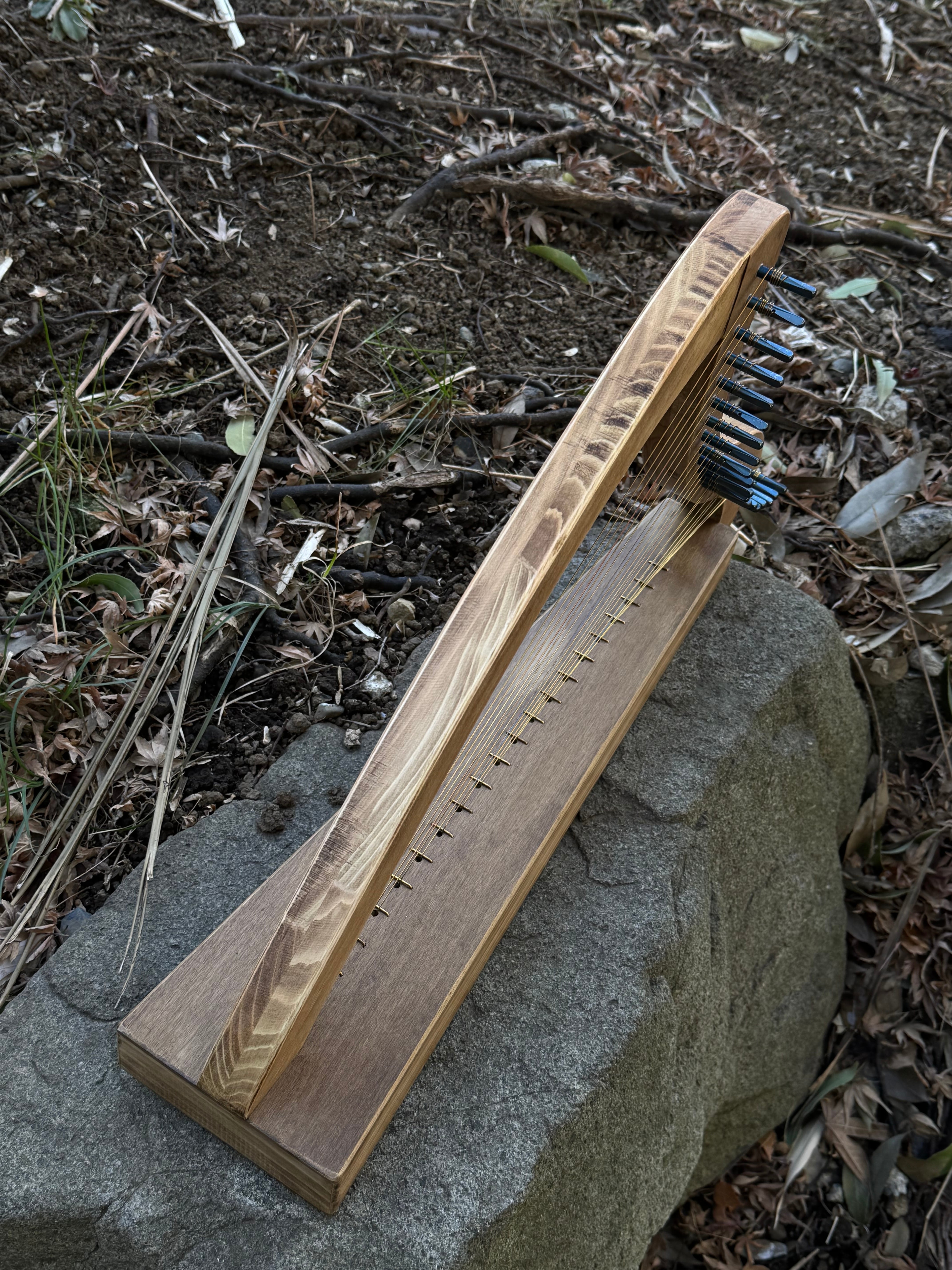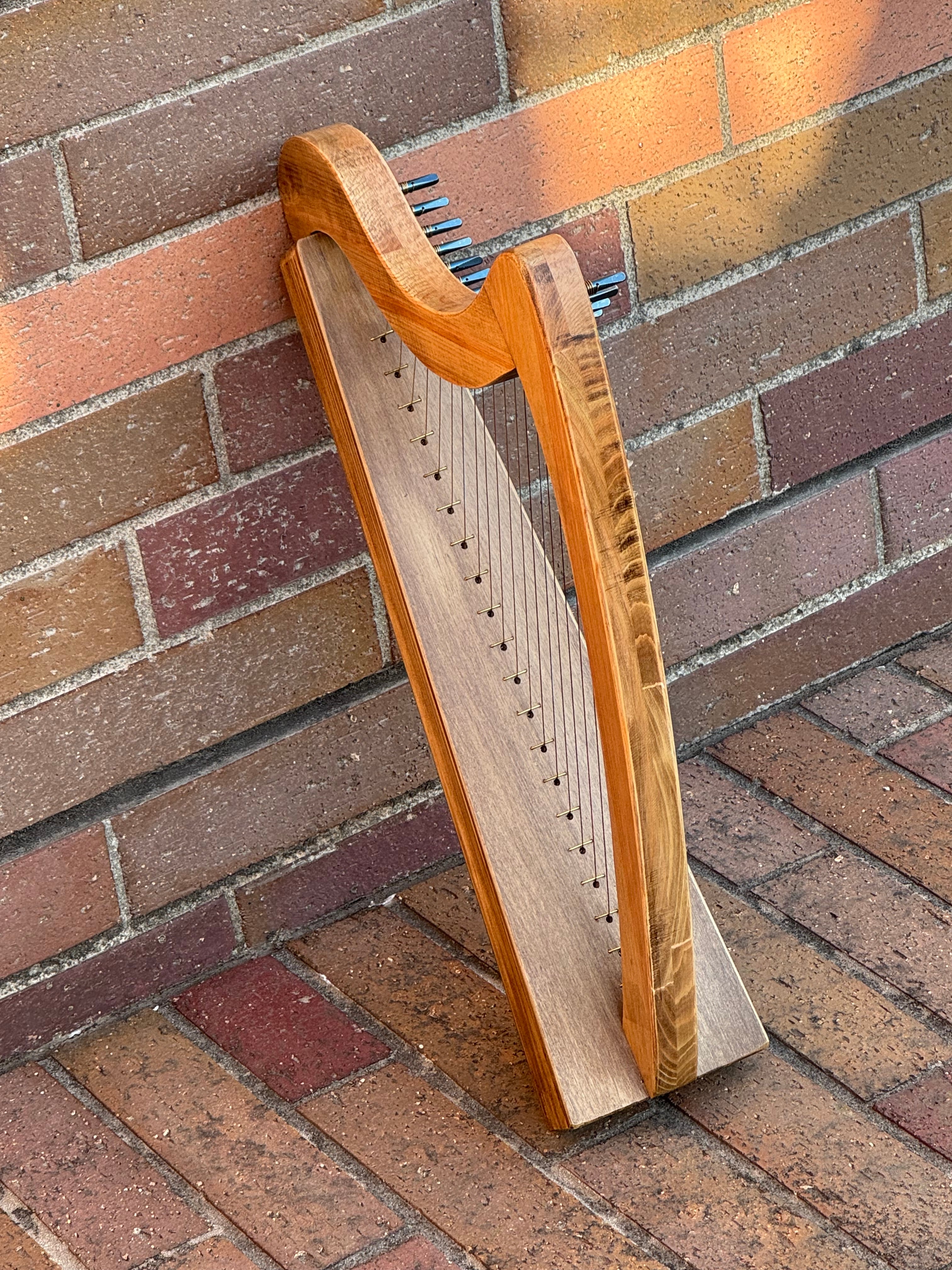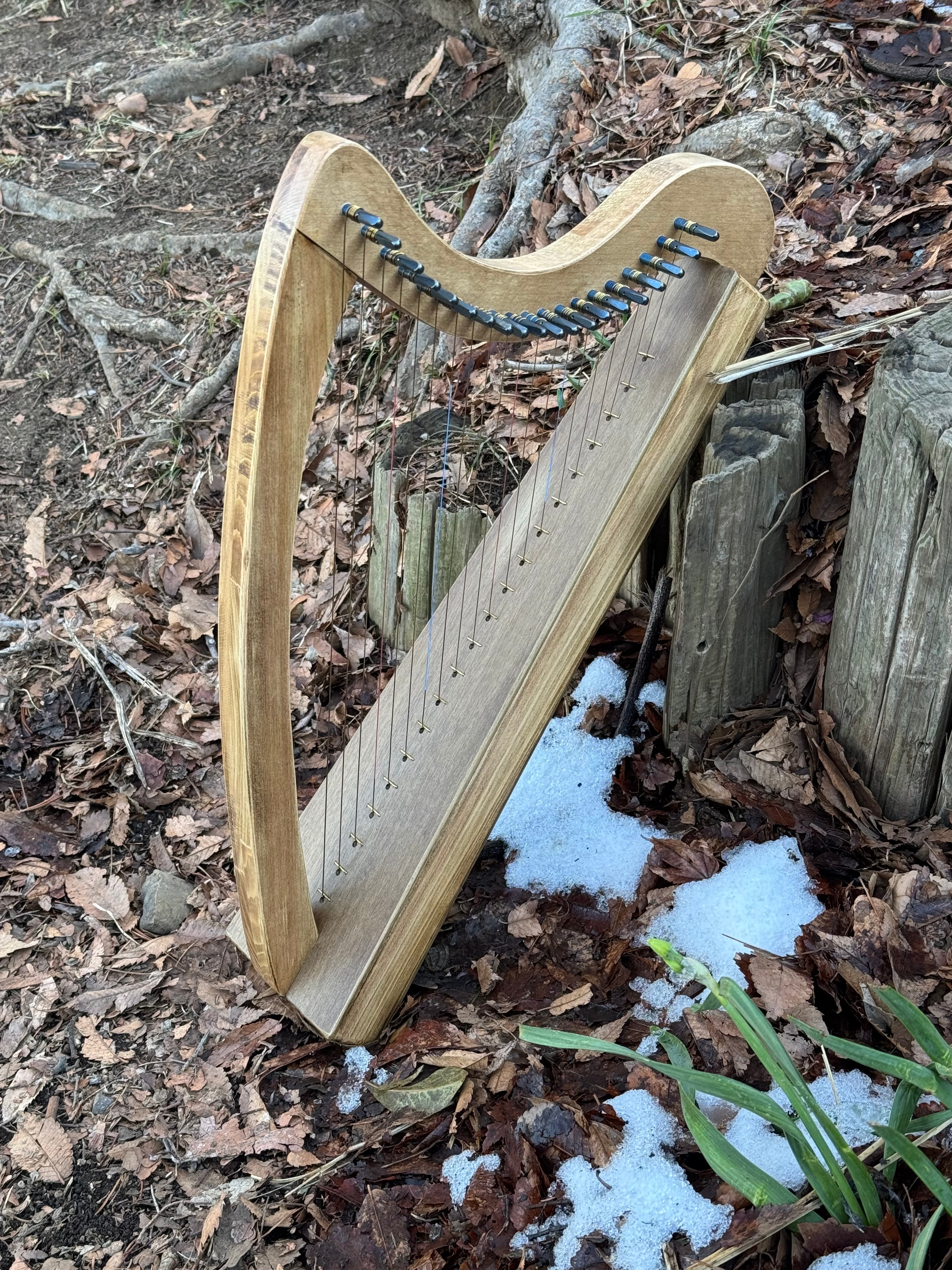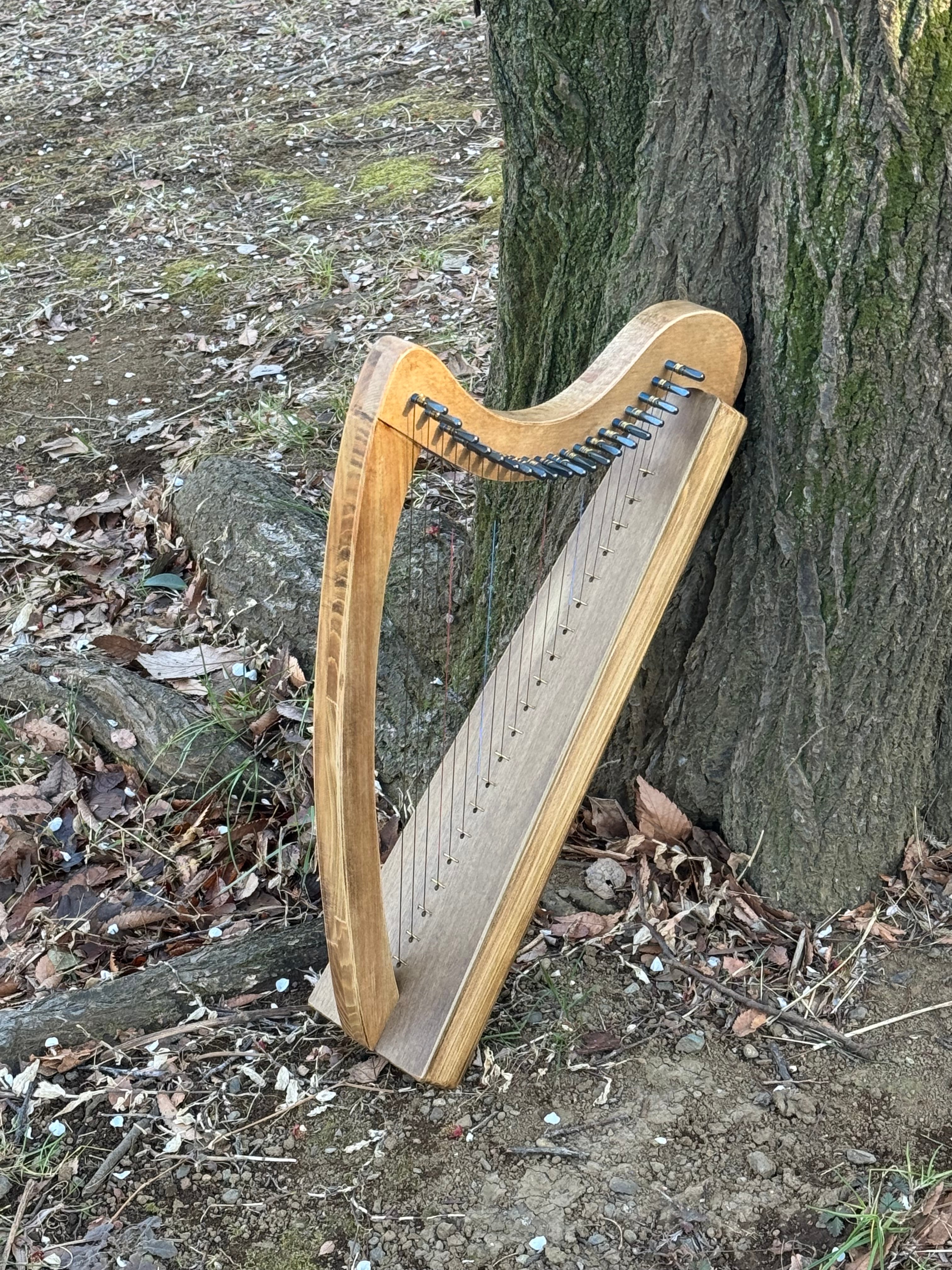 ホオとヒノキで製作した、20弦のカーボン弦ハープ。