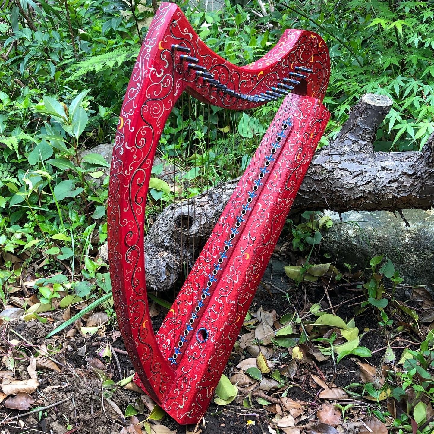 1kgと軽くて持ち運びやすく、場所を取らない20弦のハープ。音量も控えめなので、周りや時間を気にせず奏でることができます。ハープ全体にえんじ地に銀の唐草模様が描かれています。絵付け:中井智子 絵付け素材:コチニール、純銀泥、岩絵具、膠。仕上げにニスをかけているので触っても問題ありません。