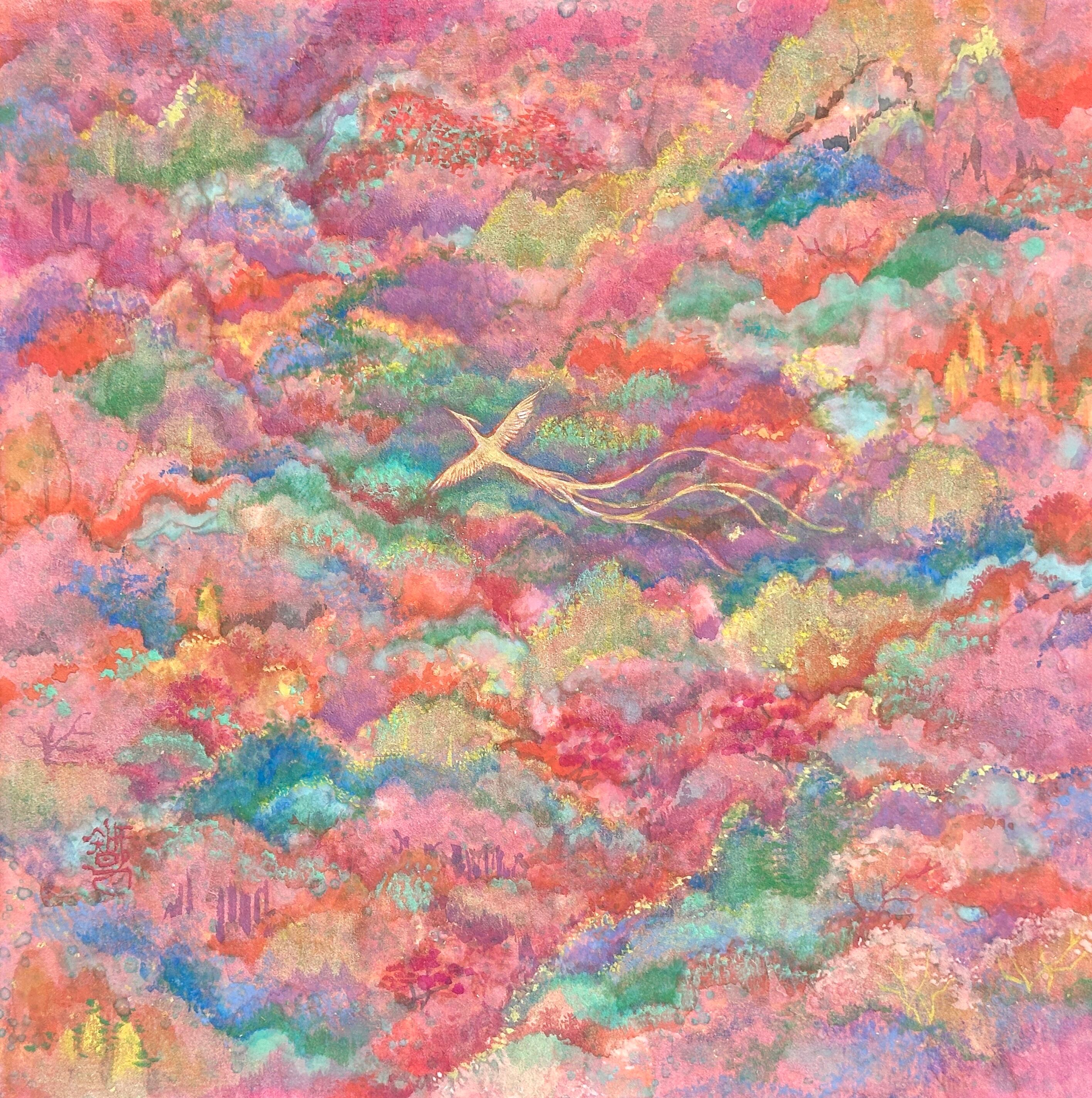 吉野山の桜のような色、常世の国のような雰囲気と鳳凰。鳳凰部分は金泥を塗った後、磨いて輝きを出しています。