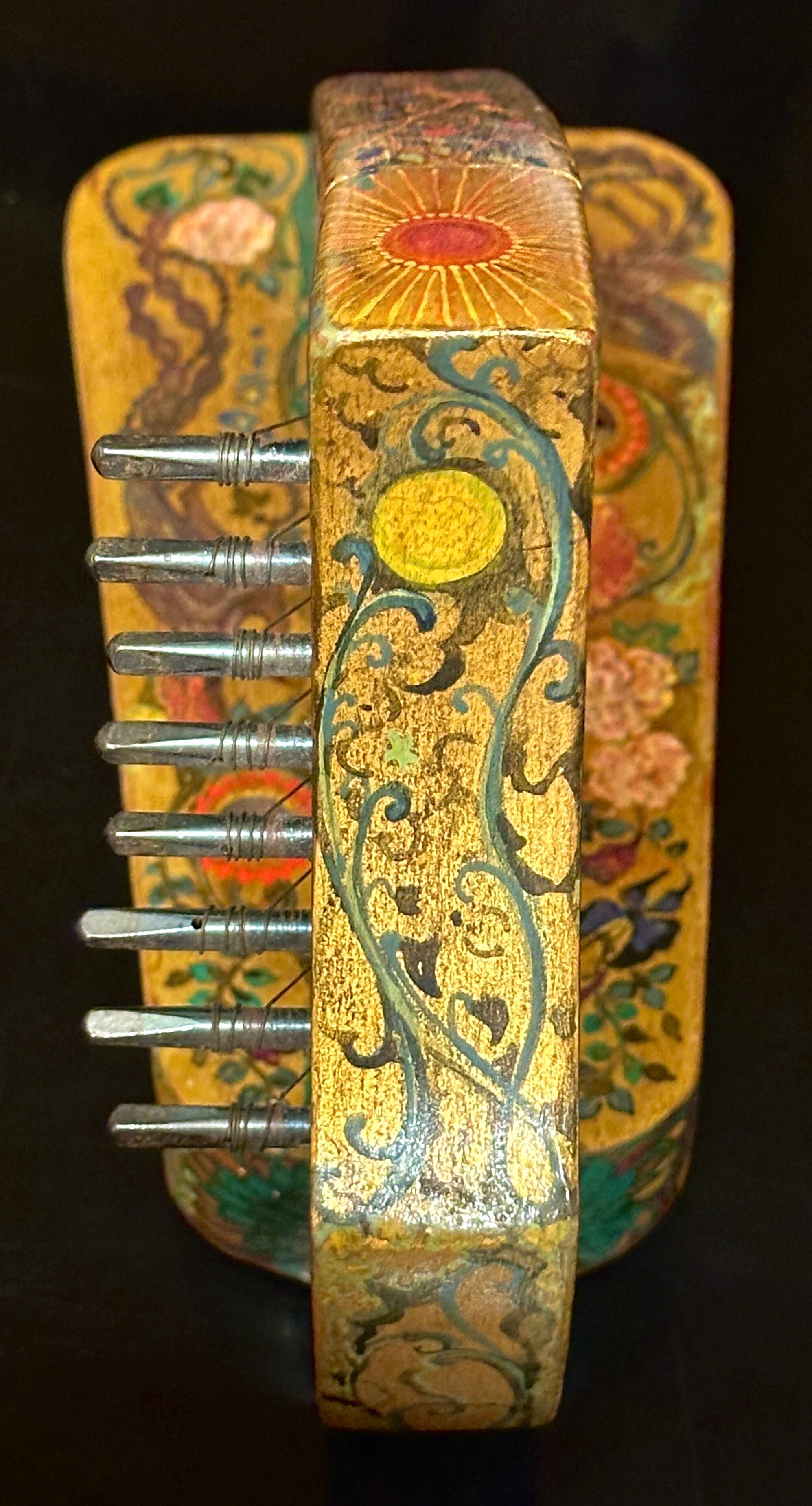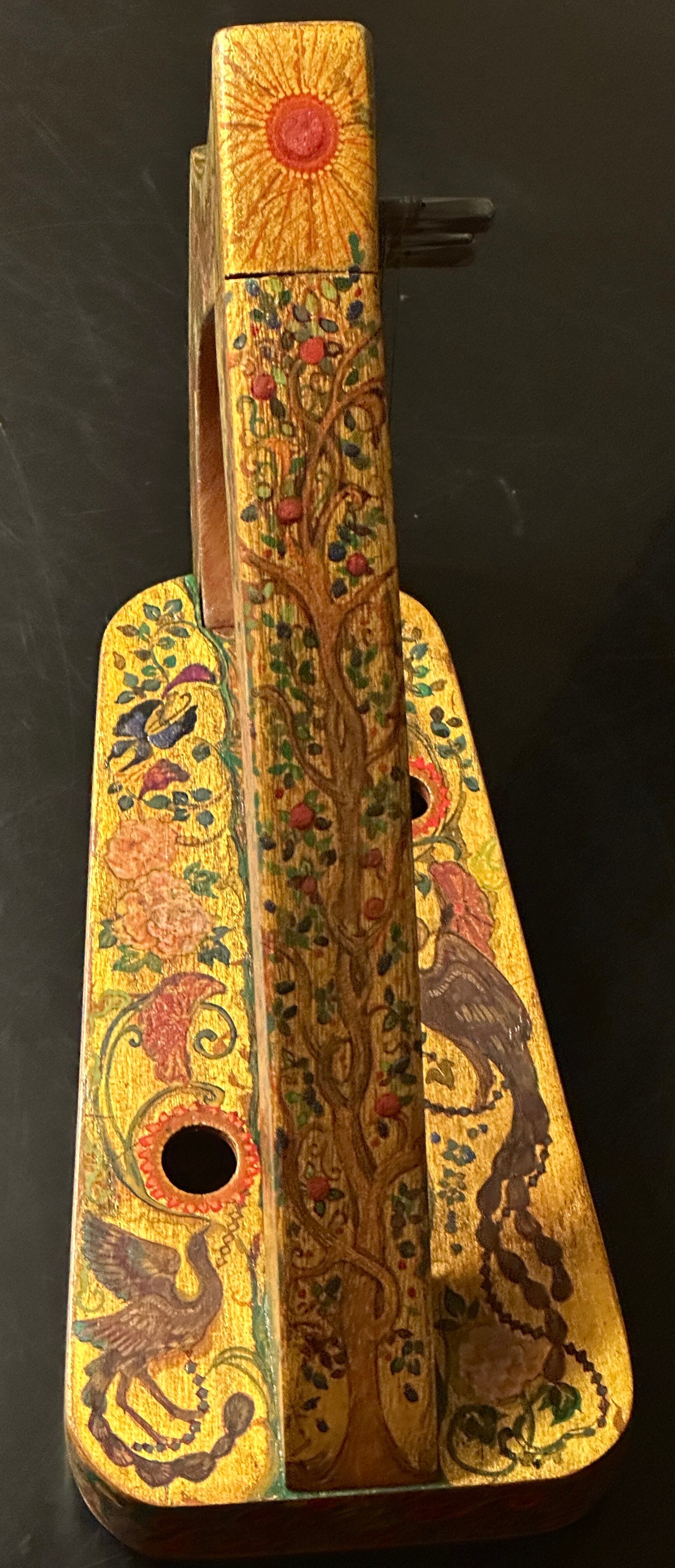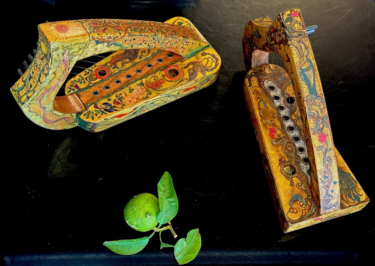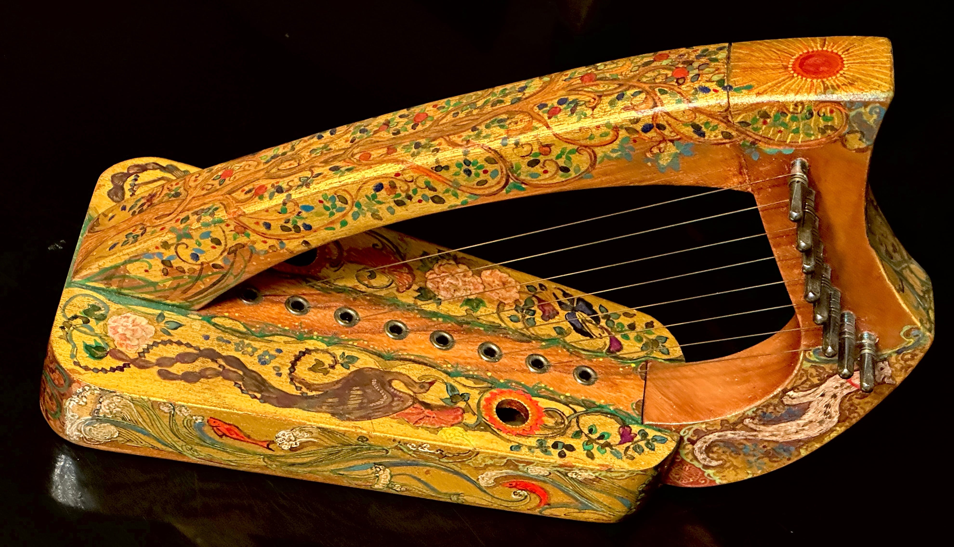 手のひらサイズの小さな金属弦ハープ。日本画家中井智子が楽園をイメージした絵付けを施しました。希少な1点ものです。