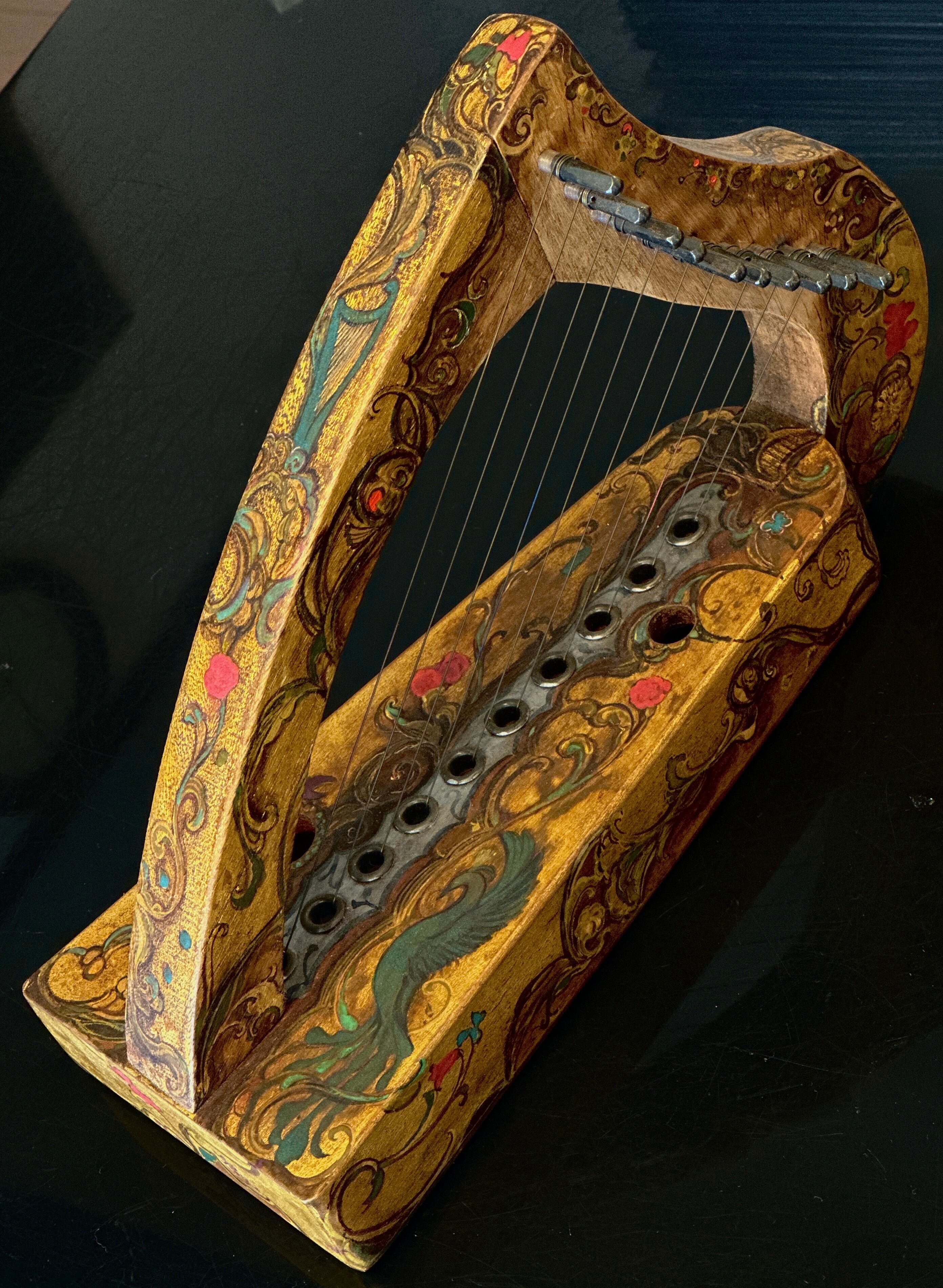 手のひらサイズの小さな金属弦ハープ。全体に花や動物などの装飾模様が描かれており、アンティーク調の落ち着いたしぶい色合いです。絵付け:中井智子、絵付け素材:純金箔、純銀泥、天然染料、墨、岩絵具、膠。仕上げにニスを使っているので、触っても問題ありません。
