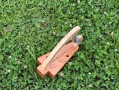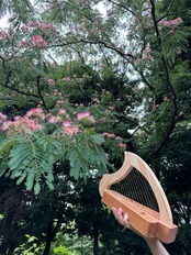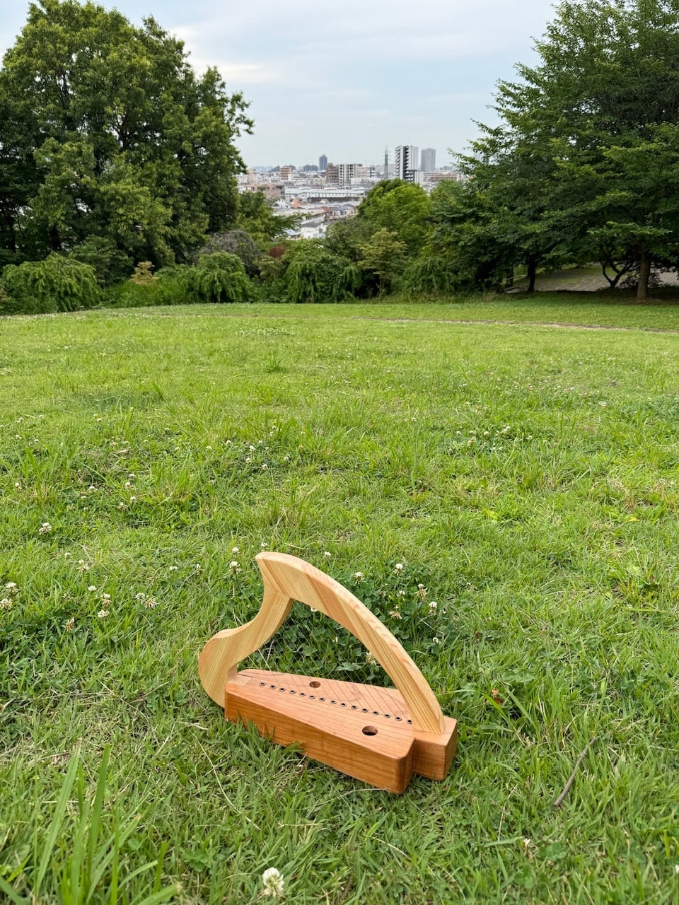 2014年4月に制作した初代モデルに基づき、デザインを改良して制作しました。ハープ制作10周年記念の特別モデル。無垢材の杢目のぬくもりと美しさを活かすために、木固めのみの無塗装の仕上げとなっております。くり抜きの共鳴胴と裏板の一体感が個人的に気に入っています。G4からG6の2オクターヴ。